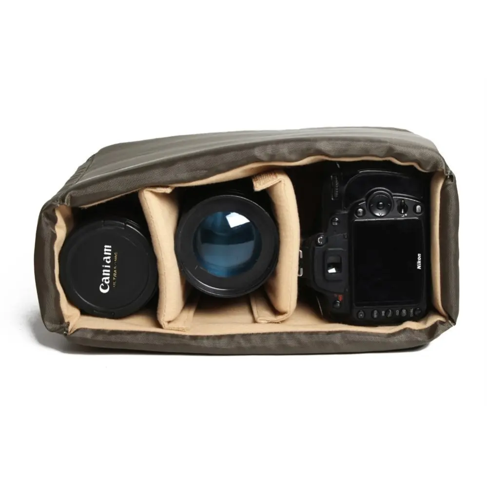 En stilren kameraväska i retrodesign för dig som vill hålla ordning och ha snabb åtkomst till utrustningen. Huvudfacket rymmer en skyddande, urtagbar insats med flyttbara mellanväggar (kardborrefäste) för enkel anpassning efter kamerautrustningen. Canvasmaterialet är vattenavstötande (ej vattentätt), och den breda axelremmen gör väskan bekväm även när den är fullpackad.