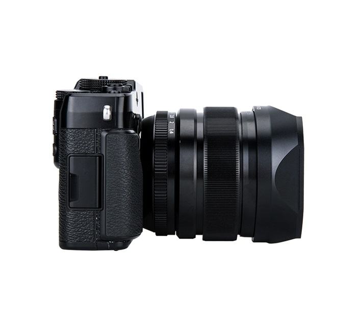 Motljusskydd och lock för FUJINON XF 23mm F1.4 R. Huvuddelen av motljusskyddet är tillverkad av aluminium, vilket gör att motljusskyddet bibehåller linsens och kamerasystemets estetiska egenskaper. Dessutom är bajonetten gjord av syntetiskt resin, vilket inte skadar ditt objektiv.