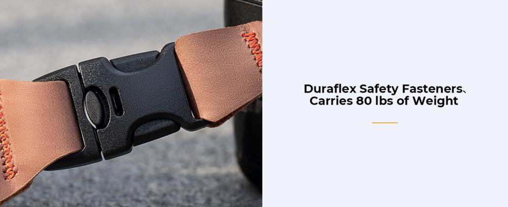 Använder Duraflex-märkets Stealth-spänne, tillverkat av nylon som nästan är okrossbart med en unik låsmekanism för att skydda din kamera mot oavsiktliga fall.