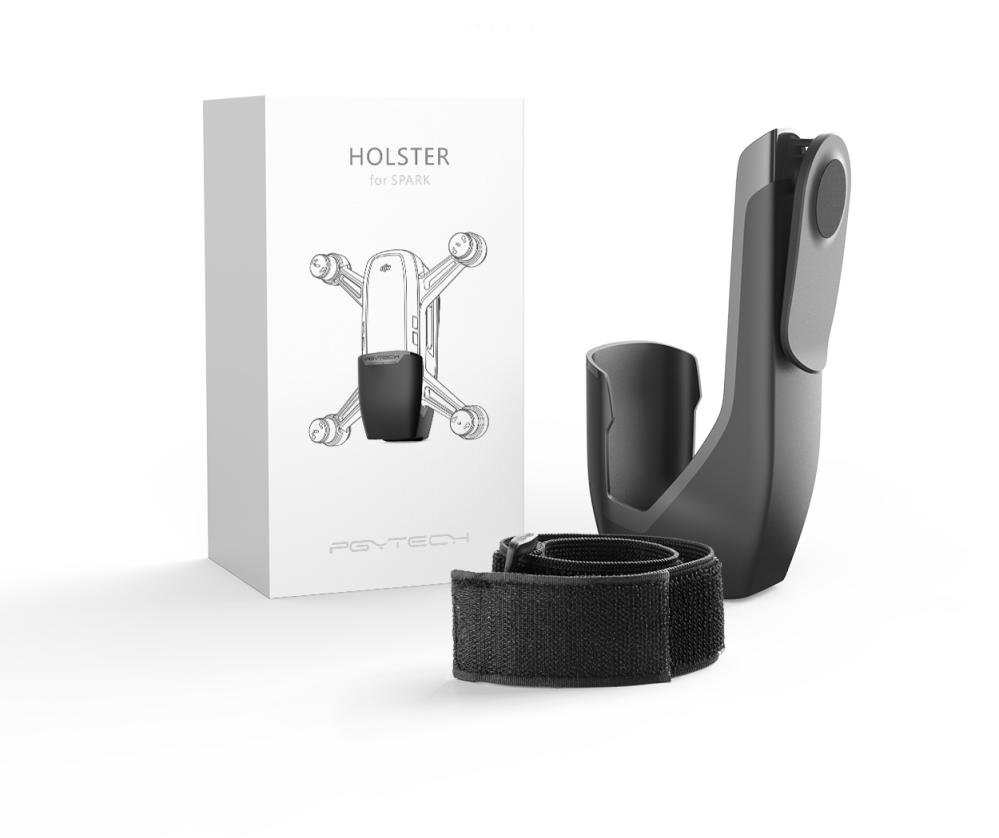 Hållaren kan med hjälp det medföljande bandet fästas runt armen eller på bältet via det inbyggda clipset. Den är designad för DJI Spark och ger ett bra skydd för kameran, sensorsystemet och positionssystemet vid transport.