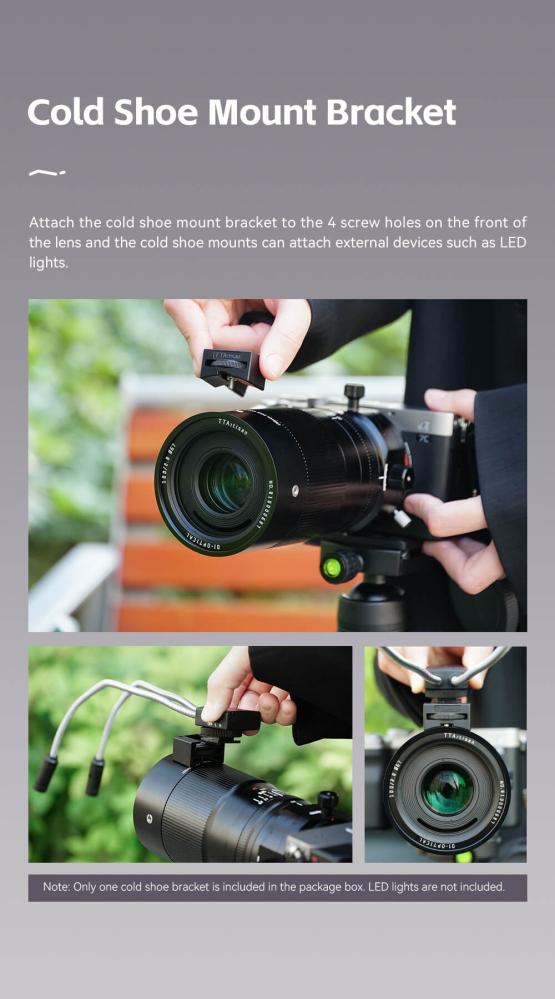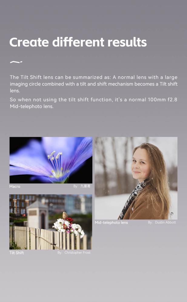 Ett perspektivkontroll-objektiv som erbjuder upp till 8° lutningsvinkel, ger dig friheten att justera fokusplanets vinkel för att matcha ditt motiv, samt för att skapa ett brett utbud av unika visuella effekter. Designat för fullformats sensor kameror, kan TTArtisan 100mm f/2.8 även användas på APS-C-kameror där det tillhandahåller en ? mm motsvarande brännvidd.